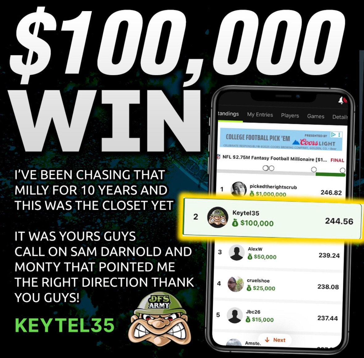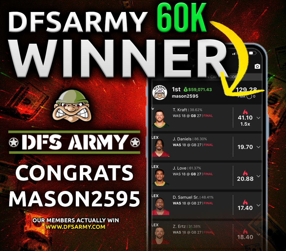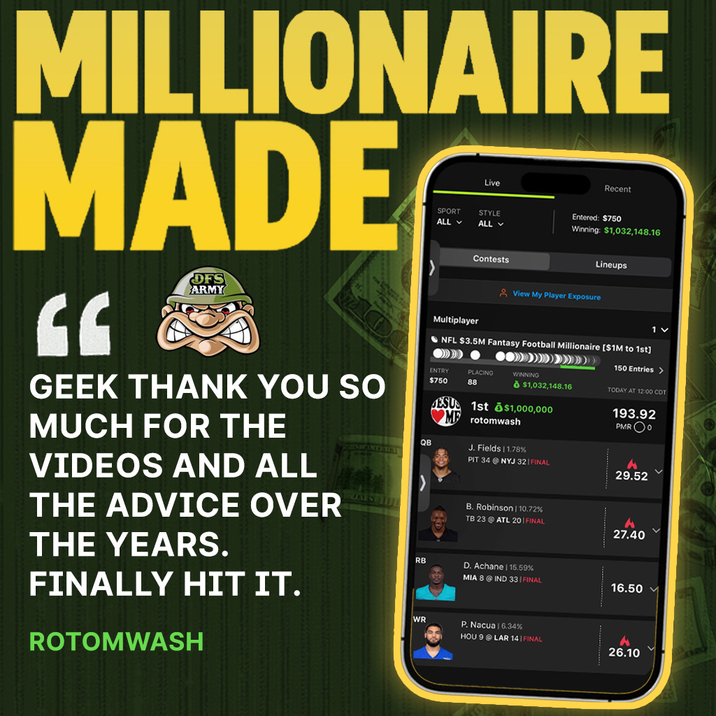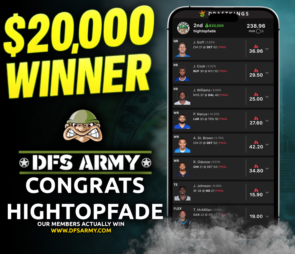 Get access to DFS Army member-only live streams and premium podcasts such as our Player’s Club NFL Stream on Saturdays where we break down the upcoming slate, show lineup construction options, and feature live Q&A.